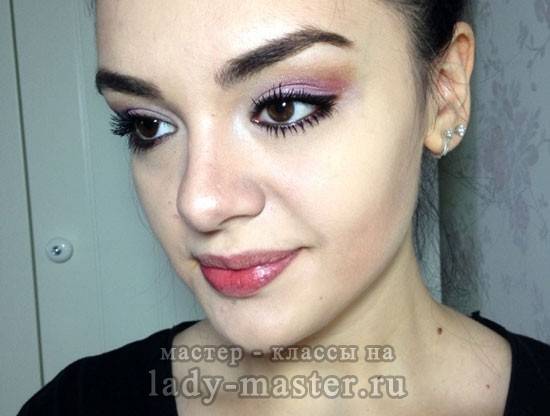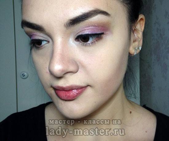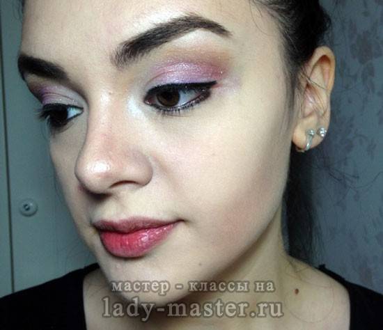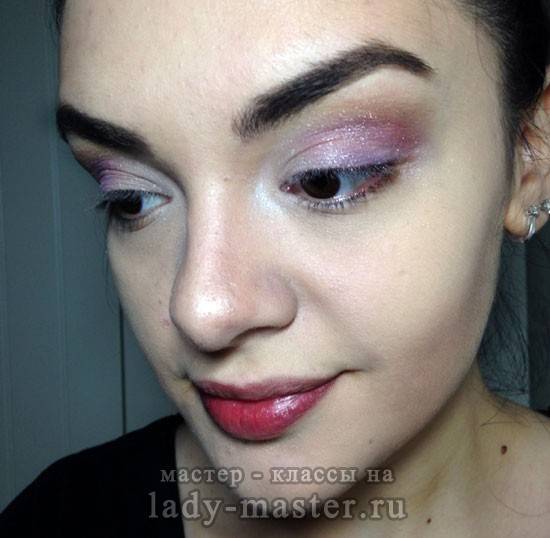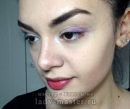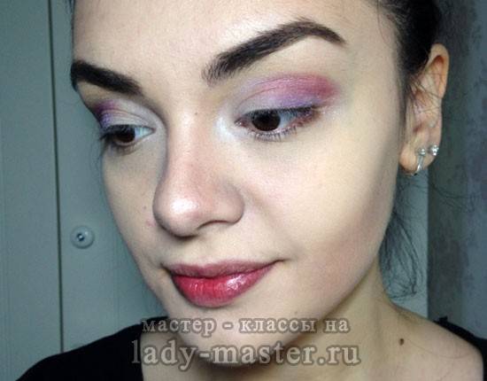 Сверху, немного отступая от внутреннего уголка, дабы оставить там замеченным предыдущие тени, наложим тонким слоем тени светло-сиреневого оттенка, тщательно при этом их растушевывая, не оставляя четких и заметных между ними границ.