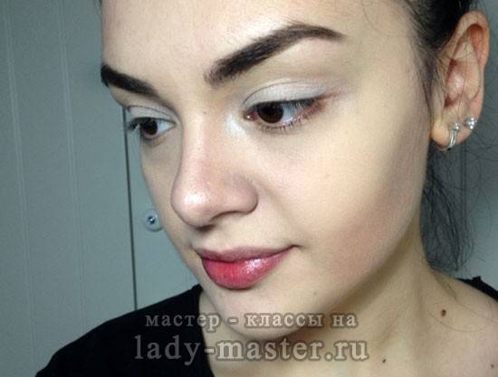 Далее на подвижное веко мы наносим тени светло-розового оттенка, приближенные к белому. Данный слой, впрочем, как и остальные, должны быть перламутровыми. Первый теневой шаг у нас будет служить основой.