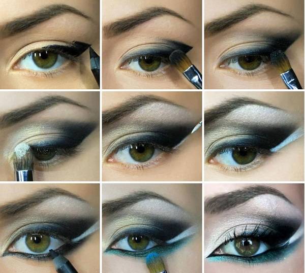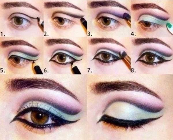 Чтобы сделать яркий акцент на глаза, рекомендуется использовать яркие цвета: фиолетовый, зеленый, сиреневый, золотисто-коричневый, пурпурный, красноватый или синий. Область под бровями выделяется светлыми перламутровыми тенями, а на внешнюю часть века наносится более темный оттенок, чем на уголок глаза.