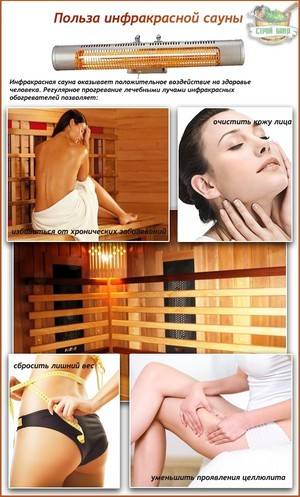 Инфракрасное излучение оказывает на организм лечебное воздействие, способствует общему оздоровлению. Многие врачи рекомендуют включать воздействие инфракрасного излучения в комплексную терапию целого ряда заболеваний. С помощью сауны можно добиться следующих терапевтических эффектов: