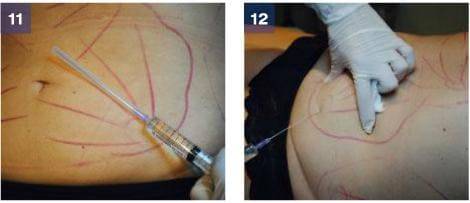 Инъекцию выполняйте ретроградно, медленно, с использованием веерной техники. На каждый проход иглы вводите максимум 0,5 мл препарата при использовании иглы 24G и 0,3 мг при применении иглы 25G. Избегайте болюсного введения. Проведите инфильтрацию препарата в квадратные участки, покрывая всю проблемную область и производя минимальное количество проколов. В зонах с наибольшей толщиной ПЖК выполните перекрестные и/или двухслойные инъекции (фото 10, 11). Когда в тканях останется только 1 см иглы, прекратите введение препарата (фото 12). Постоянно контролируйте положение иглы, чтобы воздействовать исключительно на жировую ткань.