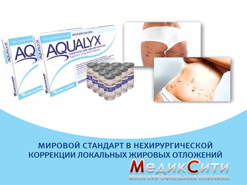 Препарат не содержит токсины, имеет биодеградирующие свойства и быстро выводится из организма. Интралипотерапия Акваликс это совершенно новая методика использования медицинских препаратов для коррекции локальных жировых отложений без оперативного вмешательства.