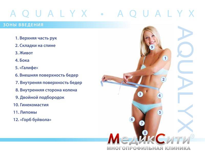 Акваликс – это не препарат для похудения, с его помощью вес сбросить не удастся. Aqualyx борется с жировыми ловушками и помогает улучшить контуры тела. Лучше всего препарат работает, если у пациента вес нормальный, но нужно избавиться от уродующих фигуру косметических недостатков – слоя жира на животе, а также избыточной жировой прослойки на бедрах, коленях, спине и даже на подбородке.