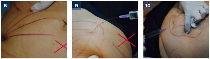 Введите иглу Lipoinject перпендикулярно коже на уровень, соответствующий середине жирового слоя, затем разверните иглу строго параллельно коже на всю длину (или до границы зоны предполагаемой коррекции). При развороте иглу оставьте в коже примерно на 1 см (фото 7). Избегайте слишком поверхностного введения иглы, ее конкурирования (фото 8), а также слитком глубокого введения иглы, так как в этом случае существует риск попадания в мышцу (фото 9).