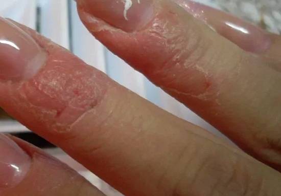 - При нарушении специалистом технологии выполнения манипуляции состав может случайно попасть на кожу или раневую поверхность, которая возникла при неаккуратной обработке кутикулы.