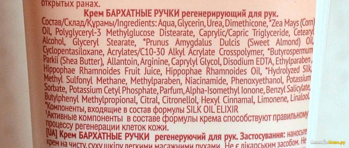 Крем содержит экстракты целебных растений, которые устраняют воспаление, ускоряют регенерацию повреждённых участков. При регулярном применении руки становятся более нежными на ощупь. Благодаря защитной плёнки исключается неблагоприятное воздействие факторов окружающей среды.