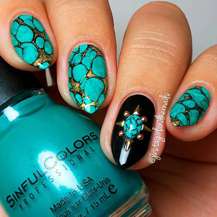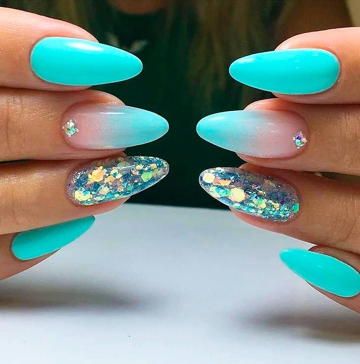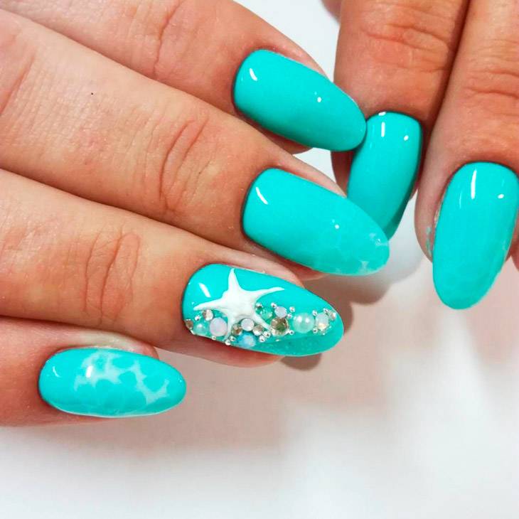 Миндалевидная форма позволяет создавать бирюзовые маникюрные шедевры, прекрасно смотрится на любых руках, визуально удлиняет пальцы рук.