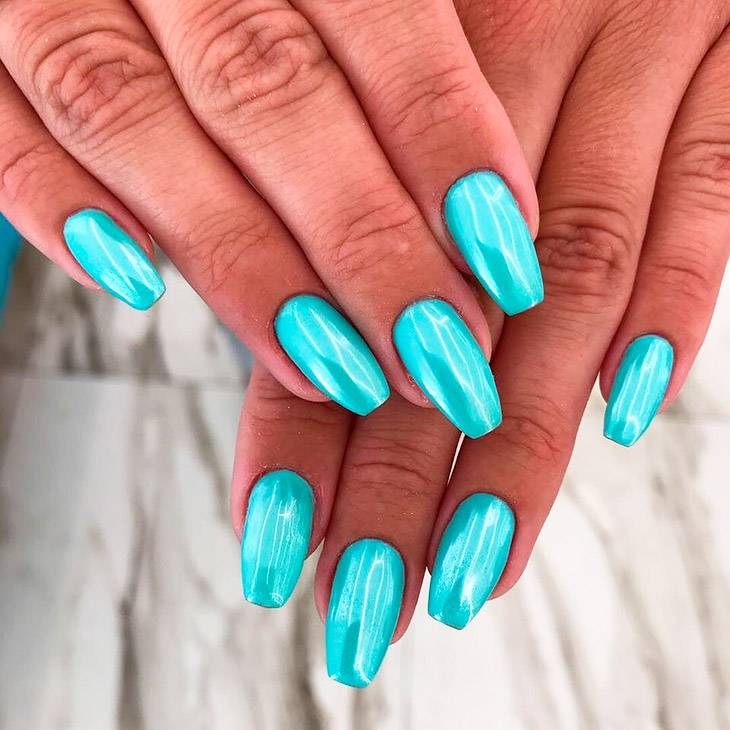 Мягкий квадрат лучше смотрится на средней длине маникюра. Практичная, не подвержена сколам, удобная. Бирюзовый позволяет пробовать технику втирка, омбре, битое стекло.