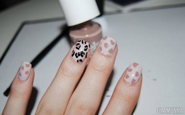Начните с нанесения основного бежевого, самого светлого оттенка. Дайте ему высохнуть и лаком более темного цвета нанесите леопардовые «пятнышки» — равномерно друг от друга, но на каждом ногте с разных сторон. Дождавшись, когда пятна высохнут, обведите их специальным карандашом или кисточкой, смоченной в черном лаке, с двух сторон, но не замыкайте в круг, сделайте так, как будто берете их в скобочки.