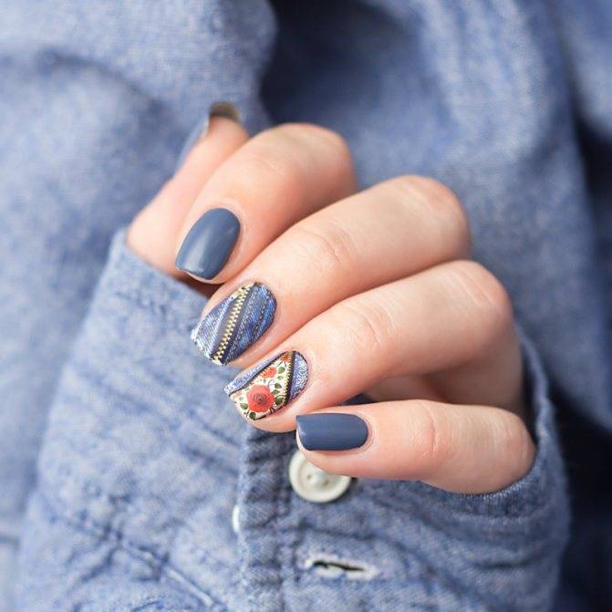 Первый дизайн, который достоин вашего внимания, – джинсовый маникюр глубокого синего цвета, напоминающего морскую пучину. Небольшая дополнительная деталь – например, застежка-молния – придаст изюминку конечному результату.