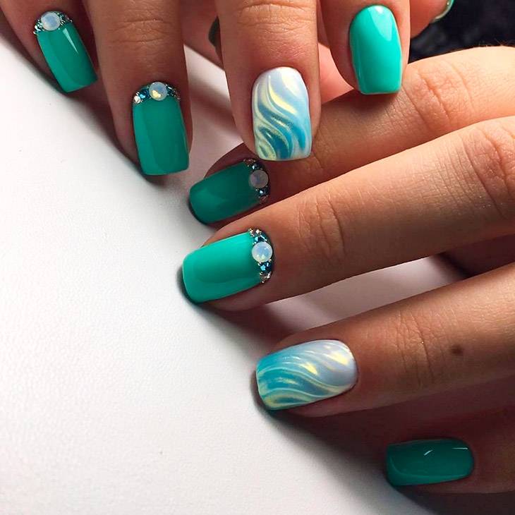 Овальный бирюзовый маникюр хорошо смотрится на небольших и тонких ногтях. Это естественно, аристократично и со стороны удлиняет пальцы. Меньше подвержена повреждениям и сколам. Форма актуальна и позволяет пробовать разные дизайны.