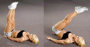 Четвертое упражнение позволит проработать нижний пресс. Лягте на пол, руки – вдоль тела, ноги – прямые, в виде прямого угла с телом. Это начальная позиция. Теперь медленно поднимайте ноги вверх, слегка отрывая ягодицы от пола и используя пресс и бедра, чуть задержитесь наверху, вернитесь на пол. Для максимальной эффективности старайтесь удерживать ноги вертикально. Для новичков допустимо отклонять ноги как на картинке.