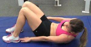 - Работа над косыми мышцами. Лежа на спине, руки сомкните за головой, ноги согните в коленях, без прижимания к ягодицам. Локоть правой руки повести к колену левой ноги. Поясницу постоянно прижимайте к полу. Скручивание требуется делать 25 раз, в два подхода. Понемногу количество повторов старайтесь увеличивать. Проделывая данные упражнения для женщин, можно достичь образования кубиков пресса.