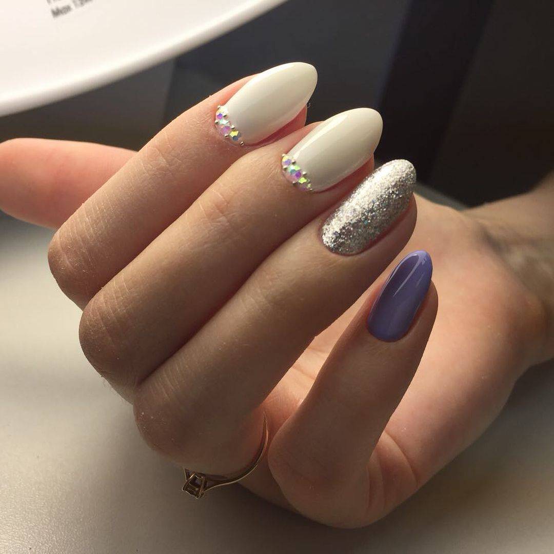 Украшают два ногтя, плотно покрывая их стразами разной величины. Подойдут стразы Сваровски, их можно приобрести в наборе. По центру, ближе к кутикуле, ставят самый крупный камень. Возле него по обеим сторонам камни помельче.