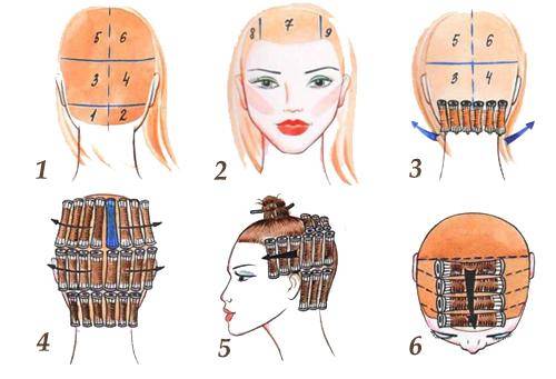 Прежде чем приступать к выполнению вертикальной химической завивки, необходимо изучить схему накручивания волос различной длины и точно ей следовать.