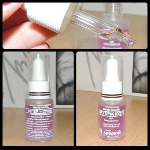 Одна из новинок в ногтевой индустрии – масляная сушка. Это прозрачный флакон, наполненный маслом. Состав наносится на ногтевую пластину пипеткой. Одной капли средства достаточно для одного ногтя: растекшаяся пленка