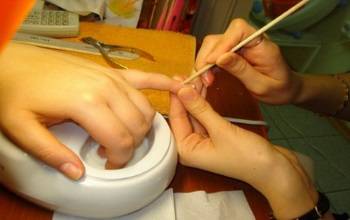 - Используя средство, не содержащее ацетон, мастер удаляет лак с рук