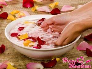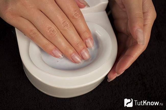 Заранее подготовьте ванночку с увлажняющим лосьоном. Напомним вам, что можно использовать обычный крем для рук или оливковое масло. Если по какой-то причине у вас отсутствует специальная ванночка, маникюр не отменяется! Альтернативой может послужить обычная мисочка. В этом случае лосьон подогревается на водяной бане. Температура состава должна быть 46-50°С. Погрузите пальчики в горячий лосьон, как это показано на фото.