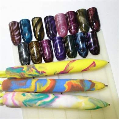 Но это не все, на что способен гель-лак «кошачий глаз». Невероятные узоры можно проделать на нем с помощью обычной магнитной ручкой от детского рисовального набора. В каждом доме, где есть дети, найдется такой набор, ведь детские магнитные доски очень дешевы и популярны. Так вот, одолжив у малыша на некоторое время магнитную ручку, можно приступать творить шедевр несколькими способами:
