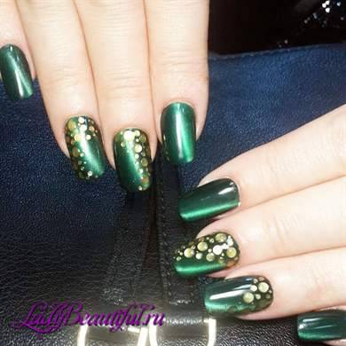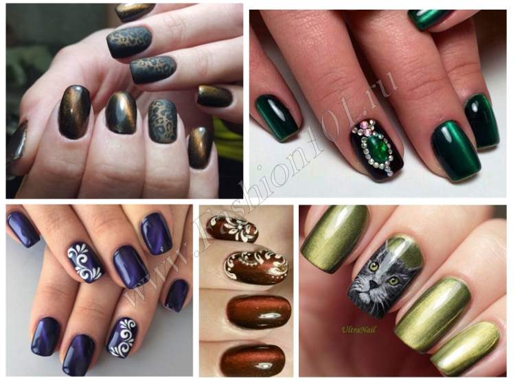 С фольгой. Маникюр кошачий глаз, декорированный оттисками фольги, будет выглядеть дорого и изысканно