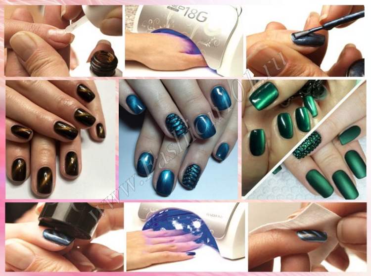 Для получения насыщенного оттенка рекомендуется применять гель-лак черного цвета. После того как на ноготь будет нанесен выбранный гель-лак с эффектом «Кошачий глаз», к его поверхности на 8-10 минут подносят особый магнит. Делать это нужно, пока он не успеет высохнуть. Имеющиеся в составе лака металлические частицы притянутся к поверхности, создавая светящуюся полоску. Можно использовать трафаретные магниты, которые помогают создать другие силуэты. После этого ногти опять надо просушить. В конце маникюр покрывают топовым покрытием и просушивают.