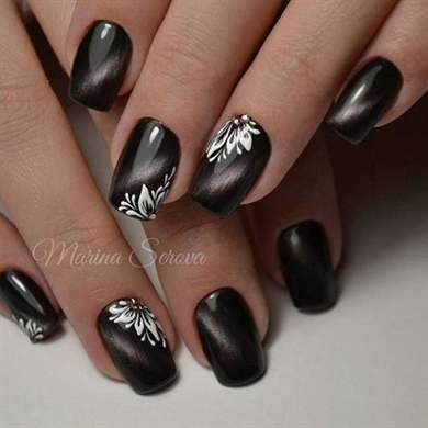 С художественной росписью. Маникюр кошачий глаз, выдержанный в светлых тонах, также будет гармонировать и с рисунками. Наиболее популярным вариантом на сегодня являются флористические художества, выполненные в технике тонких линий. Раскрас таких рисунков должен быть обязательно темным. Уместными будут и разноцветные художества, которые должны быть расположены на одном пальце.