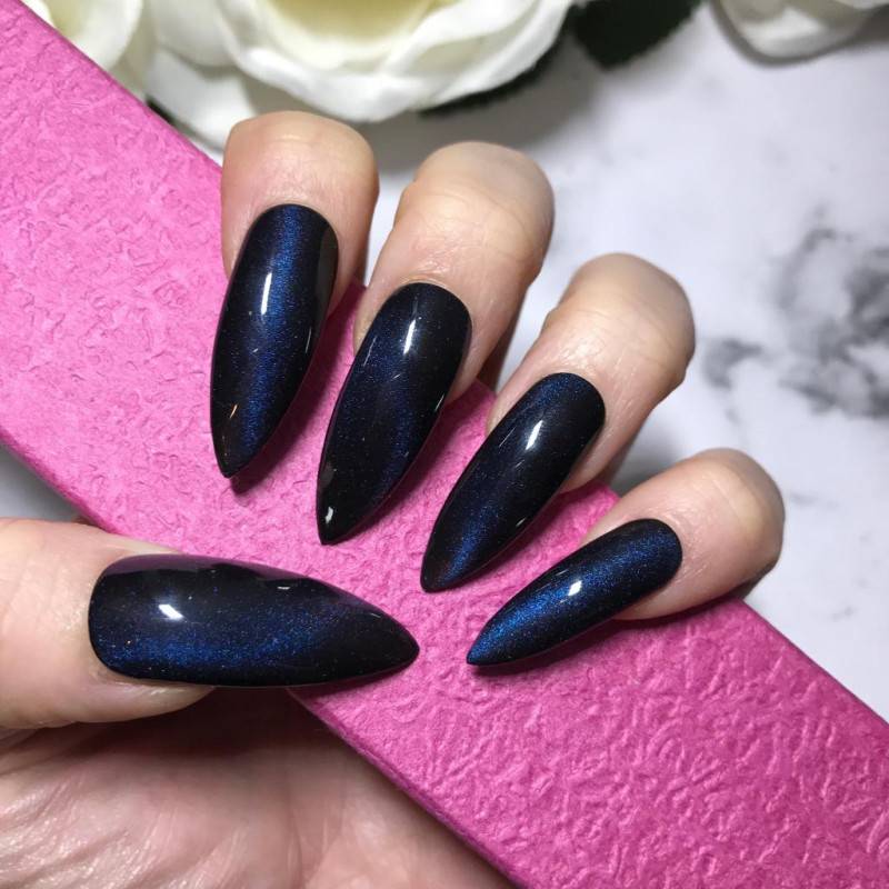 - Самый яркий цвет вы получите, если наносить гель-лак кошачий глаз на черную подложку (обычный черный гель-лак, который обязательно нужно просушить, другие темные цвета будут влиять оттенок, однако это тоже можно использовать как изюминку для разнообразия своей палитры).