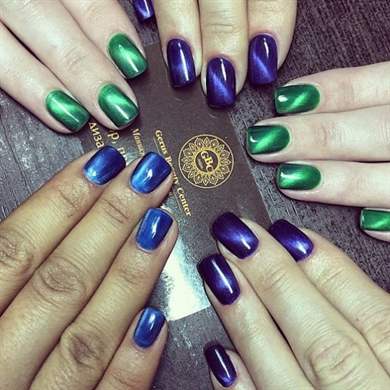 - Гель-лаки с эффектом кошачьего глаза обычно очень плотные, однако для максимально красивого эффекта лучше всего наносить гель-лак поочередно, и каждый ноготь сушить в лампе по-отдельности после создания эффекта магнитом.