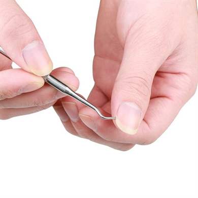 Пушер. Этот инструмент с необычным названием чрезвычайно практичен и удобен. Он представлен металлической палочкой с 2-мя рабочими поверхностями на концах. Один конец — это лопаточка, которой очень удобно отодвигать кутикулу, так как она идеально соответствует форме ногтя. Другой конец представлен в виде заостренной пики, с помощью которой очень удобно подчищать пространство вокруг ногтя.