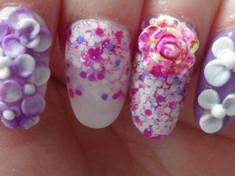 Маникюр с лепкой обычно выполняют на искусственных ногтевых пластинах, иначе он может смотреться нелепо и грубо. Объемной лепниной также не рекомендуют украшать короткие ногти, которые могут приобрести громоздкий и неаккуратный вид.