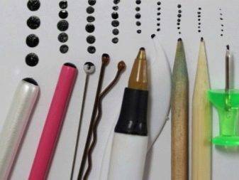 Так, дотс можно заменить исписанной шариковой ручкой, шпилькой с круглым концом. Кисточку можно взять из старого лака, предварительно очистив ее. Нужную форму ей придают с помощью ножниц, постепенно выстригая волоски по одному у основания крепления к ручке.