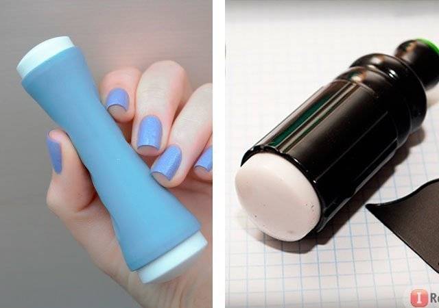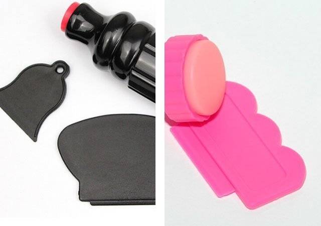 - штамп — инструмент для переноса рисунка с трафарета на ноготь. Он имеет подушечку, которую прислоняют к узору на пластине, а затем к ногтю. От жесткости подушечки зависит четкость будущего рисунка.