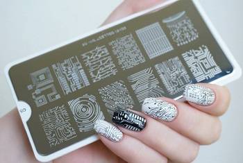 - Пластины — круглый или прямоугольный металлический трафарет многоразового использования, на котором может быть выгравировано от 4 до 42 узоров и рисунков для дизайна. Новые пластины сверху покрыты защитной пленкой, которую перед дизайном нужно аккуратно снять. Чтобы рисунок получился четким, гравировка должна быть хорошего качества, достаточной глубины.