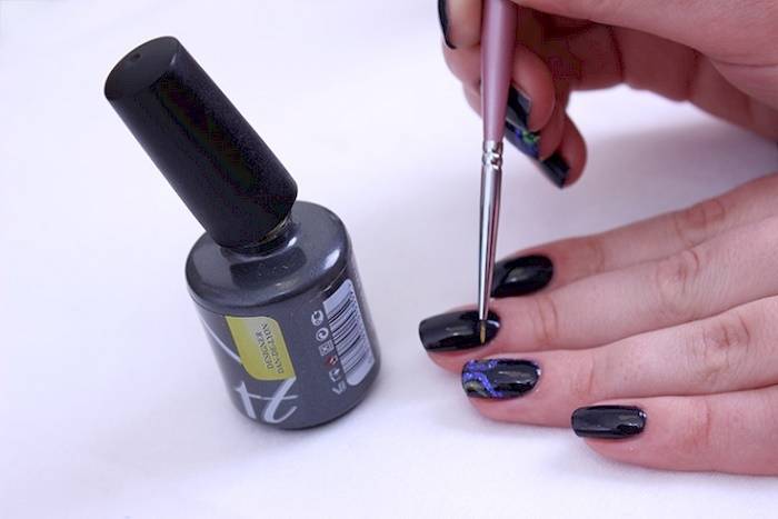 - При нанесении гель-лака под покрытие лучше отступить примерно миллиметр от кутикулы и боковых валиков. В противном случае частицы на них налипнут, ногти будут выглядеть неаккуратно.
