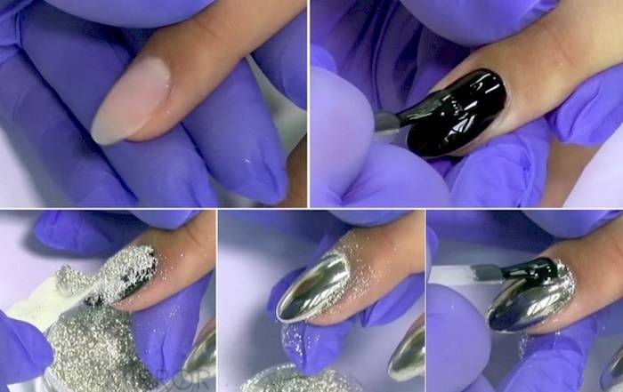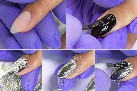 Перед нанесением втирки нужно приготовить все необходимое для маникюра, определиться с оттенками и дизайнами. Полностью зеркальное покрытие на все ногти делается не всегда, чаще им делают акцент на 1-2 пальцах каждой руки.
