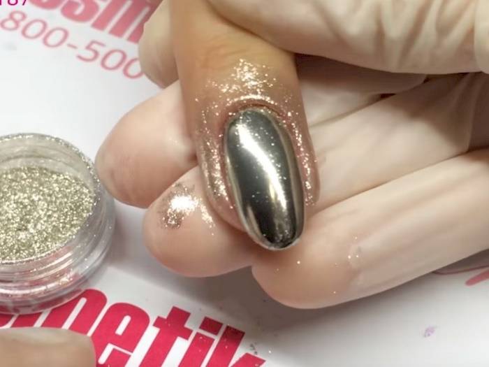 - Металлик. Втирка позволяет сделать зеркальный дизайн ногтей. В баночке она выглядит как металлическая пыль серебристого, платинового или медного оттенка, но при нанесении на ногтевую пластину создается эффект переливающегося «волшебного» зеркала.