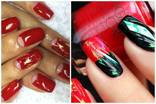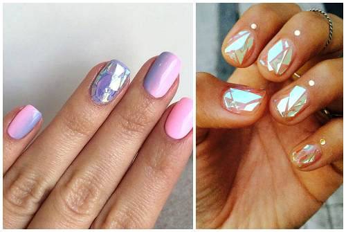 Разбираясь, как сделать «Битое стекло» на ногтях, нужно понимать, что осколки этого материала на самом деле использоваться не будут, так недолго и травмироваться, нося подобное «украшение». Эффект мерцания достигается при помощи стилизации под стекло кусочков специальной фольги или полиэтилена, имеющего голографическое покрытие. Причем готовые, уже нарезанные «осколки», специально предназначенные для создания нейл-дизайна можно купить в специализированных торговых точках. Лучи солнца или ламп красиво отражаются и играют на их поверхности, создавая тот самый неповторимый эффект разбитого зеркала.