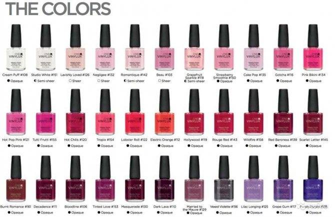 Палитра цветов Vinylux Несмотря на все перечисленные достоинства, покрытие серии Винилюкс также обладает и небольшим количеством недостатков. К ним можно отнести следующие: