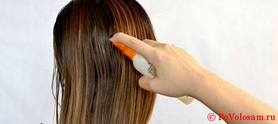 Определившись, важно знать вид, способ нанесения приспособления. Маслом в дозированной бутылочке взбрызгивают мытые влажные локоны на расстоянии 10-15 см. Затем расческой проходятся по волосяному покрову, закрепляют феном