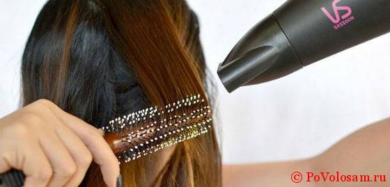 - активируя работу фена на прохладном режиме, по очереди расчесываются локоны сверху вниз круглой расческой;