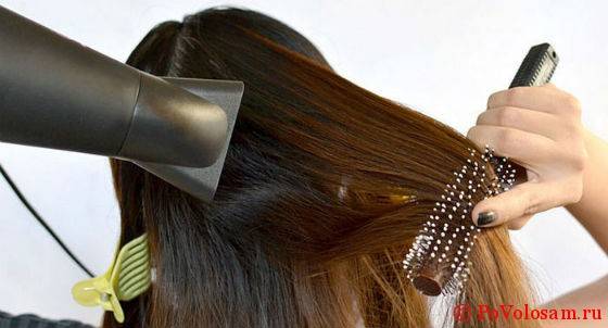 - Затем волосы сушат феном, вытягивая круглой щеткой отдельные тонкие пряди.