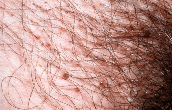 Еще один признак педикулеза — пятна на коже синевато-красного цвета. Возникают они после укуса насекомого вследствие кровоизлияний и концентрации компонентов распада гемоглобина. Размер пятен может достигать в диаметре 1 см. На пораженной коже часто появляется сыпь, гнойные пузырьки и мелкие папулы.