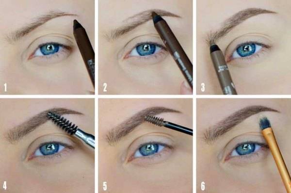 Поэтапное оформление бровей карандашом выглядит следующим образом: