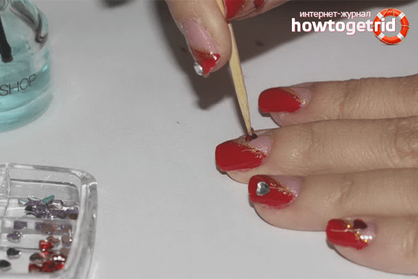 Как видите, ничем особым такой вариант действий не отличается, только искусственные камни укладываются не на гель, а на специальный косметический клей, который можно приобрести практически в любом специализированном магазине.