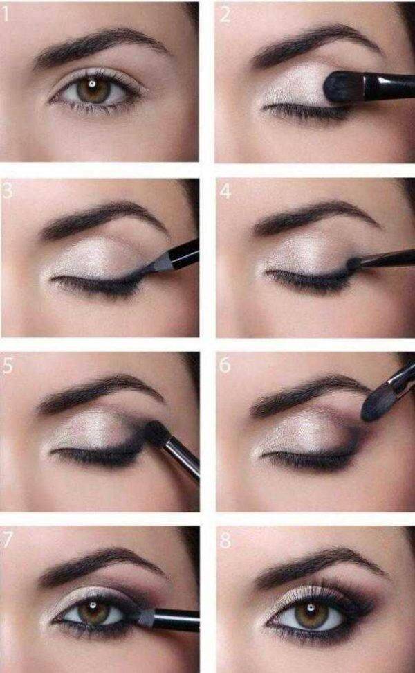 1 черным карандашом прокрашиваем верхнее веко, проводим линию вдоль роста ресниц: главное хорошо прокрасить промежутки между ресниц, затем эту линию растушевываем;.2 далее черные или другого цвета тени наносим на подвижное верхнее веко, как бы вбивая цвет, (не размазывайте, а то тени могут посыпаться, и макияж будет выглядеть неаккуратно);.3 берем серые или графитовые тени (в случае если делаем классический макияж в черном цвете) и наносим их чуть выше основного черного, с внешнего угла так чтобы цвета перемешались, главное чтобы цвет плавно переходил из одного оттенка в другой;.4 берем светло-серые или телесные тени, наносим их в складку века, при этом, не закрывая глаз, и снова хорошо растушевываем, чтоб цвета смешались, и переход был мягким;.5 переходим к нижнему веку: при помощи кисти вдоль роста ресниц проводим светло-серыми тенями линию до внутреннего уголка;.6 линию под бровью можно осветлить телесными или светлыми матовыми тенями с мерцанием, это оживит газ и сделает его более выразительным. 7. отдохни от теней попробуй один день не краситься тенями. Многие женщины поражаются, как здорово смотрится кожа их век без краски.