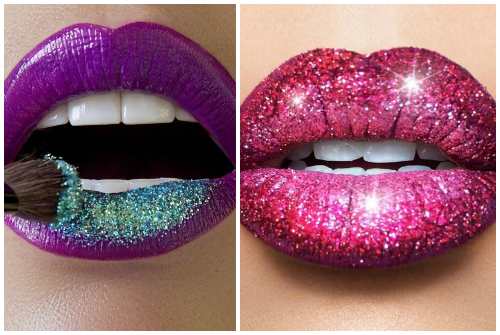 Тени для век держатся не хуже мелкого глиттера. Если все губы усеяны блестками, то обязательно следите, чтобы не испачкать посуду, из которой пьете. Данный прием привычнее применять с блеском.