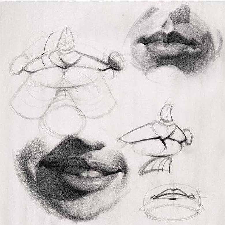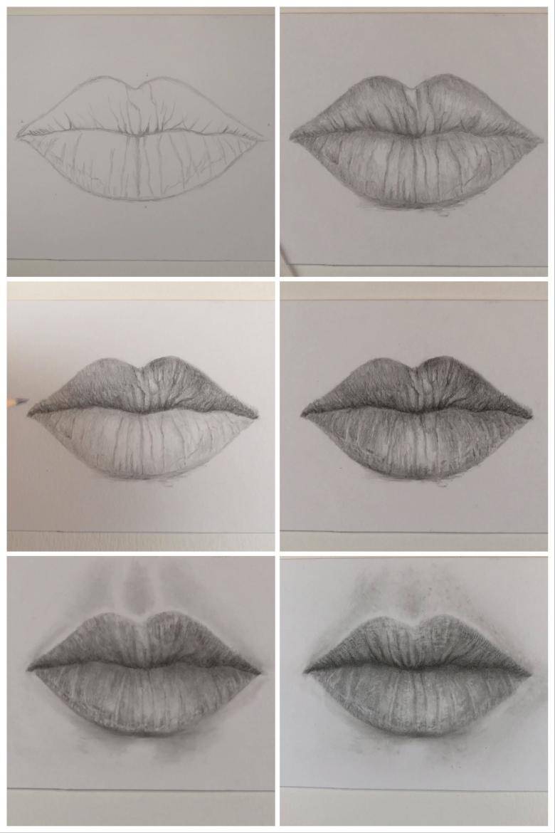- Закрасить верхнюю губу, плавно делая переход на светлую область ограниченную черточками. Чётче выделить уголок и нижний край губы. Аккуратно заштриховать все участки на нижней губе, оставив нетронутой верхушку окружности (блик). Добавить тень на впадинке над подбородком.
