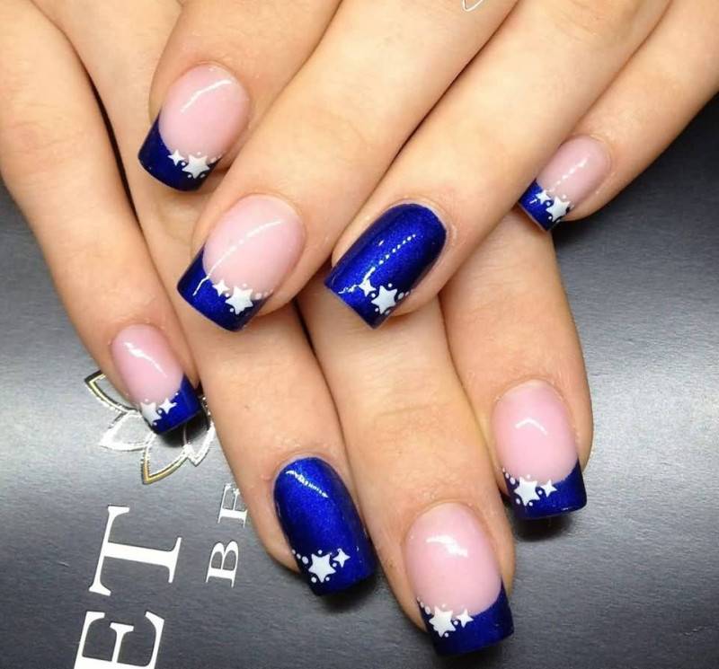 Насыщенный синий маникюр добавляет глубины и аристократичности, но наряд к нему следует подбирать тщательно. Синий фон маникюра подчеркнет платья светло-серого и серебристого цвета, хорошо будет выглядеть сочетание глубокого синего с отливом материала наряда и такого же маникюра. Маникюр темно-синего цвета уместно разбавлять белым и серебристым рисунком. Платья василькового и бирюзового цветов будут стильно подчеркнуты маникюром нежно-голубым с белым. Оттенки синего цвета в маникюре неплохо выглядят с черными нарядами, но они мало подходят для выпускного вечера, так как образ становится тяжелым.