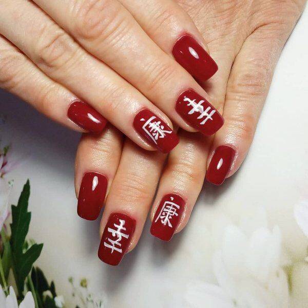 Восточный знак, обозначающий слово будущее, нарисованный на красном гель-лаке, выглядит броско и эффектно. От такого рисунка исходят вибрации приближающихся положительных изменений. Это своеобразный сигнал окружающим, что женщина готова к любви и новым отношениям.