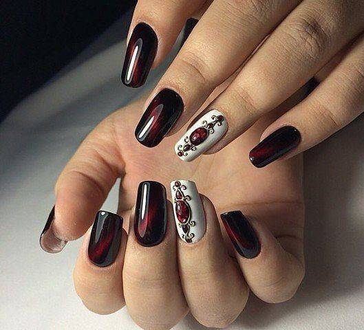В этом сезоне среди модниц пользуется популярностью градуированный маникюр (омбре). Такой вариант отлично сочетает два и более контрастных цветов, подходит тем женщинам, которые выбрали вечерний наряд нейтральных однотонных оттенков. Хорошо смотрится контраст красного цвета с черным в таком варианте. Его также можно разнообразить стразами или другими украшениями.